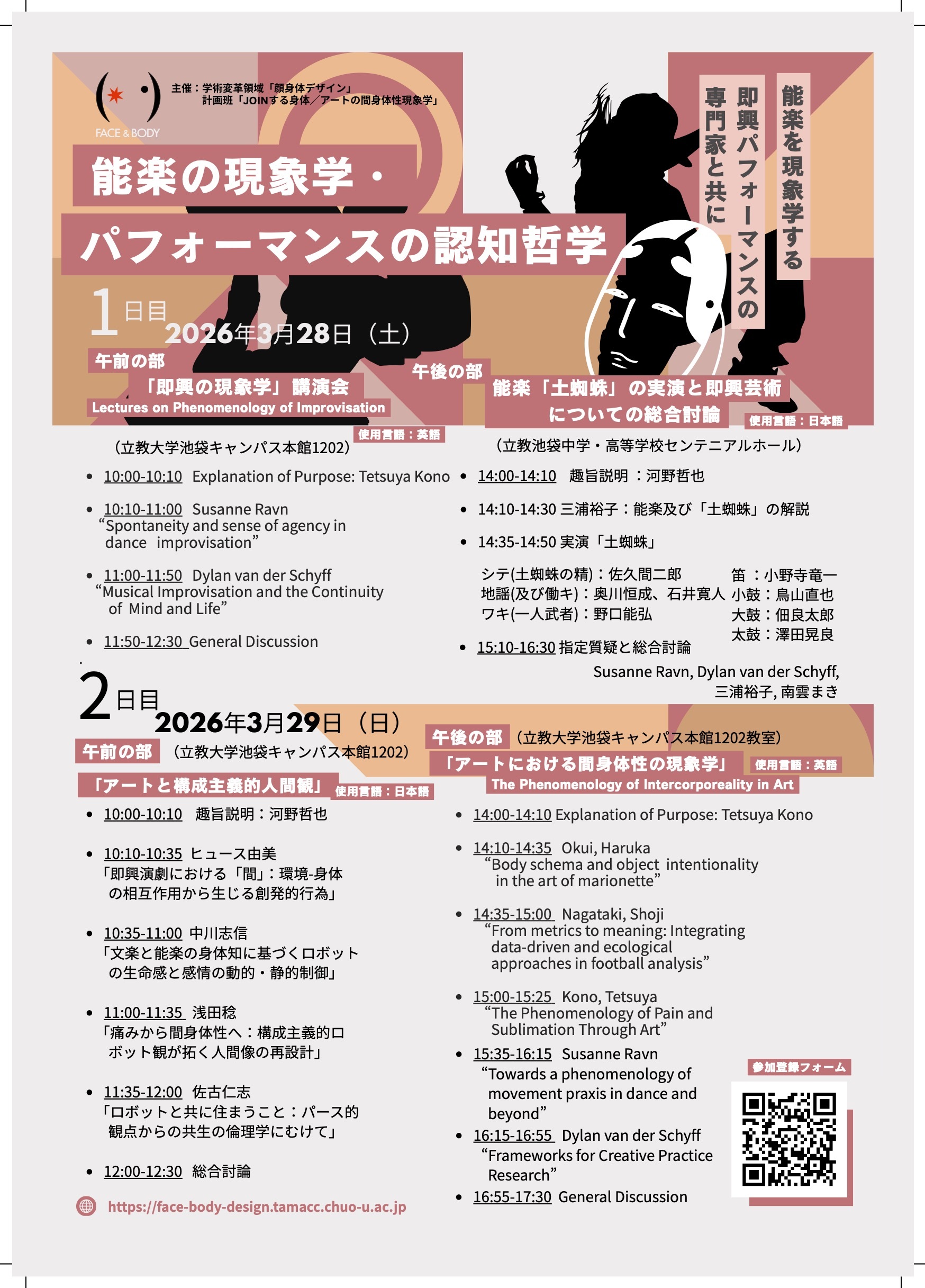 学術変革領域A「顔身体デザイン」領域事務局より「能楽と現象学・パフォーマンスの認知哲学」国際シンポジウム開催のご案内です。関連学会へご案内させていただいておりますため、重複でのご案内となりましたら何卒ご容赦ください。